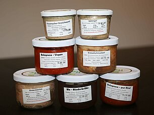 Als gelernter Metzger verarbeite ich unser Fleisch unter anderem zu Leberkäse, Streichwurst, Griebenschmalz, Presssack und anderen Brotzeitschmankerln. Probieren solltet ihr unbedingt auch unsere wechselnden hausgemachten Gerichte wie Bolognese-Soße, vegane Pasta-Soße, Pulled Beef, Rindergulasch, saures Lüngerl, verschiedene Suppen und Eintöpfe, sowie unsere Hüttn- und Pfefferbeißer.