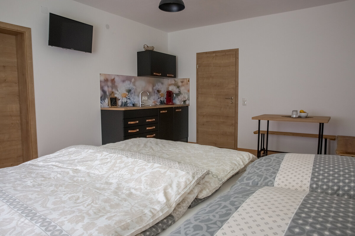Die Ferienwohnung besteht aus einem Wohnraum mit Doppelbett, einer Kochnische, einer kleinen Sitzgruppe mit Fernseher, sowie einem Badezimmer mit Regendusche.