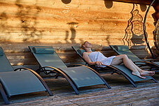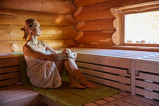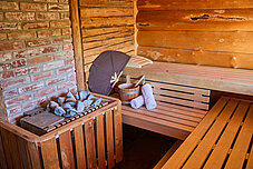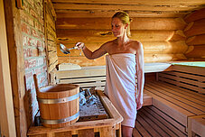 In liebevoller Handarbeit entstanden, verwöhnt unsere Sauna euren Körper mit Wärme. Der Alltagsstress löst sich, die Seele atmet auf und das Immunsystem wird gestärkt. Mit Aufgüssen könnt ihr jederzeit selbst nochmal richtig einheizen und so eure Saunagänge individuell nach euren Wünschen gestalten. Die nötige Abkühlung gibts unter der Outdoor-Dusche. Zum Ausruhen stehen Liegen im Sauna-Vorraum und im Freien bereit.